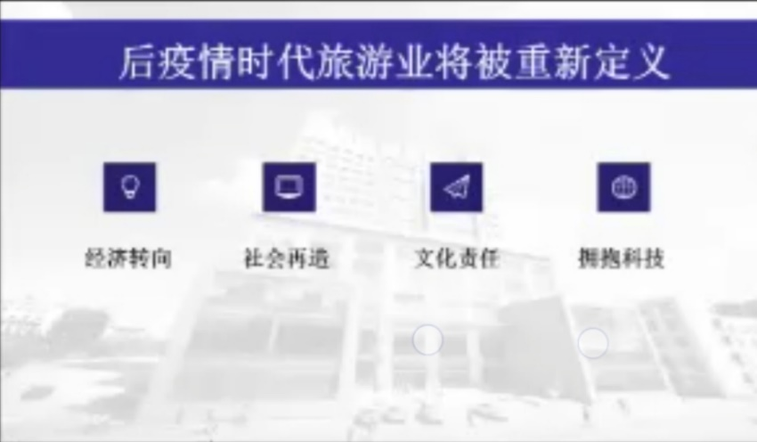 刘海洋老师以此结论,引出了本次会议关于“后疫情时代旅游业如何发展”的主题,并通过经济、社会、文化、科技四个方面向员工重新定义旅游业。