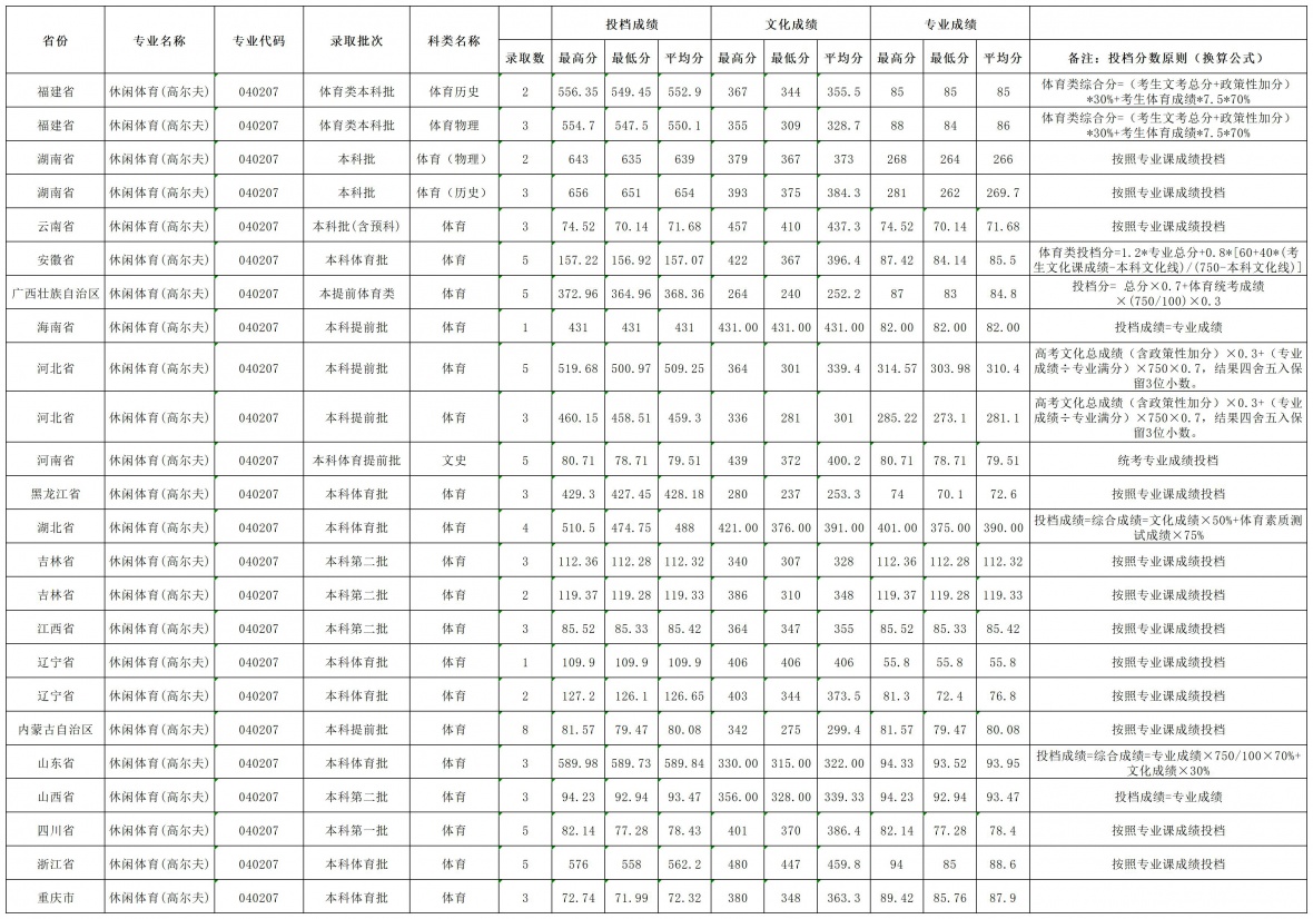 2022年休闲体育(高尔夫)专业各省市录取分数及综合分算法: