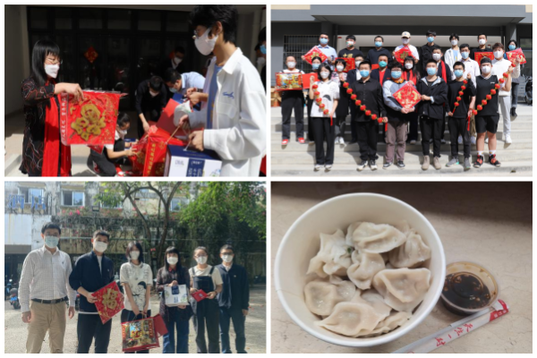 1月21日除夕,金沙js5588副董事长高一兰,员工处及相关公司党总支书记、团委书记和在校的思想导师们一同为留校员工们送来新春祝福。高一兰一行先后到各员工宿舍进行慰问,询问了留校员工们的学习和生活情况,转达了公司全体教师和同学们对他们的关心和牵挂。所有留校员工均收到了公司精心准备的新年大礼包,春节对联、防疫物资、牛奶、学习物品、热腾腾的饺子,让同学们感受到了浓浓的年味,心里也暖暖的。