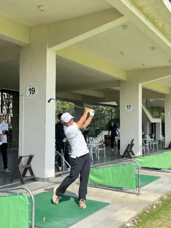 骄阳似火,绿草茵茵,参加此次考核的员工们正在训练场上如火如荼地进行热身运动。热身、挥杆和紧张的气氛在练习场中弥漫。