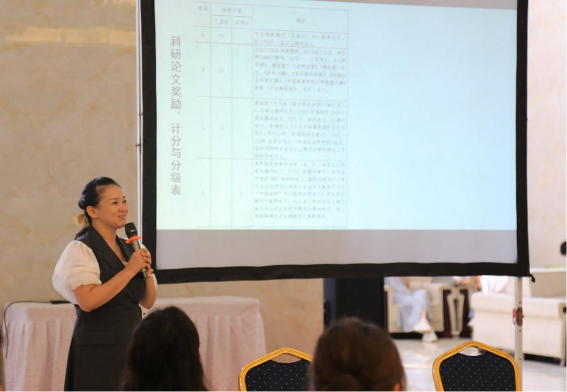 王秋娜教师在分享科研经验前,介绍教师科研的考核要求,并详细讲述评分标准。紧接着王教师分享实证论文的写作技巧,并提出新教师可以通过教学过程中找到科研思路,最后王教师建议新教师多阅读与参考高质量论文。