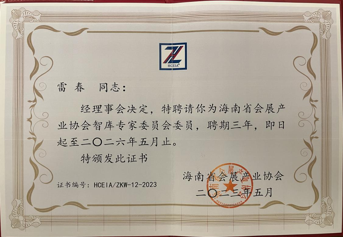 近日,海南省会展产业协会智库专家委员会授证仪式活动在三亚市举办。经海南省会展产业协会理事会决定,特聘请公司会展经济与管理专业主任兼三亚市会展产业协会副会长雷春副教授为海南省会展产业协会智库专家委员会委员。