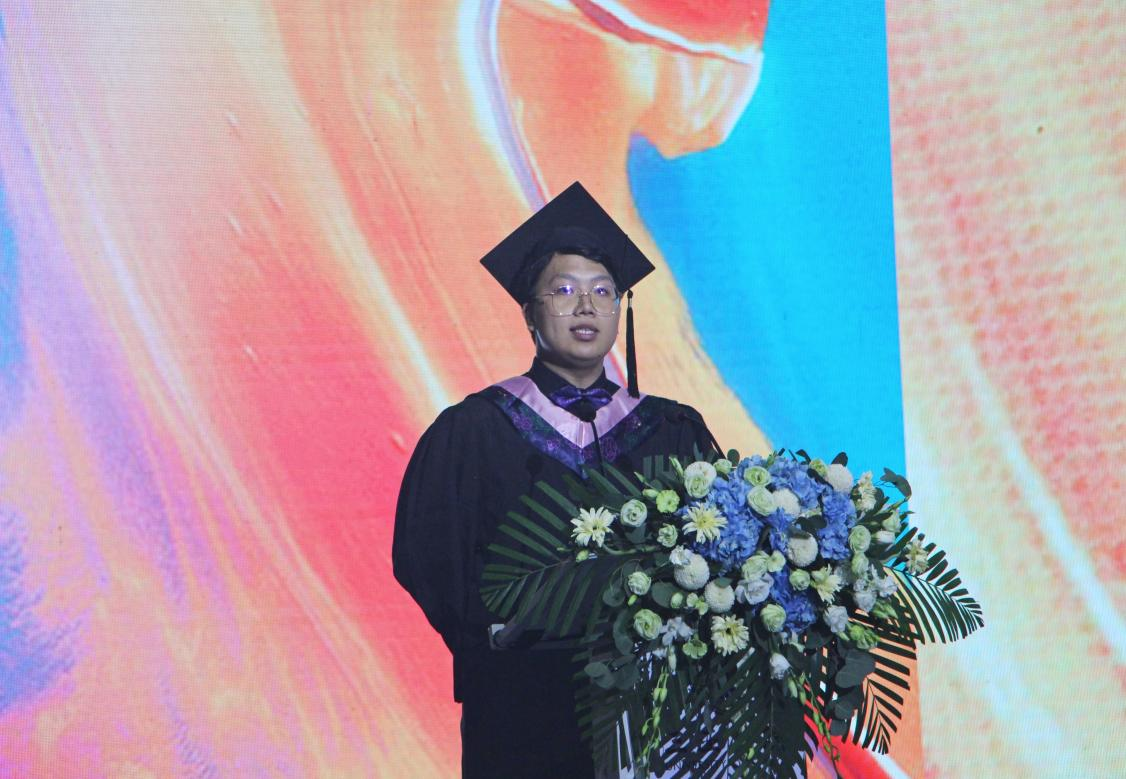 来自健康与产业管理公司的毕业生郑舒涵代表2023届全体毕业生发言,四年时光历历在目,是对同窗的不舍情谊,是对教师的感恩情谊,更是对母校的感谢情谊。他表示,作为新时代老员工要做拥有智慧并富有激情的人,做胸怀大志并脚踏实地的人,做负有责任并敢于勇挑重担的人,不畏艰险、追求卓越,要坚定理想信念,投身基层实践,为祖国发展奉献自己的力量。
