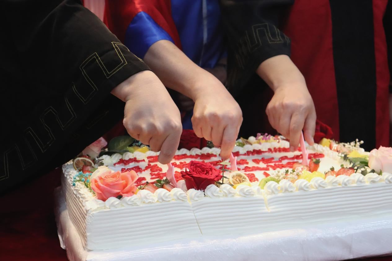 随后,师生互相赠送礼物环节,母校将一枚刻学号与姓名、凝结大学青春的戒指作为毕业礼物送给毕业生们,并共同切毕业快乐蛋糕,希望以后的生活能够圆圆满满、甜甜蜜蜜!