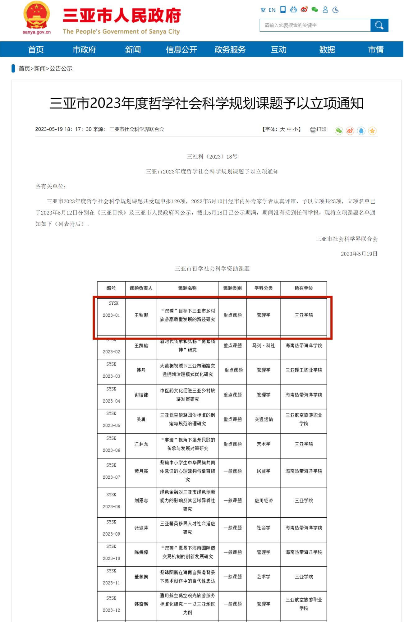 在三亚市2023年度哲学社会科学规划课题的申报中,共收到129个项目的申请。经市内外专家学者的认真评审,最终有25个项目获得了立项资格,其中包括6个重点项目。王秋娜老师的研究项目以其独到的视角和深入的研究方法引起了评审专家们的高度认可,以第一名的成绩获得重点项目立项。