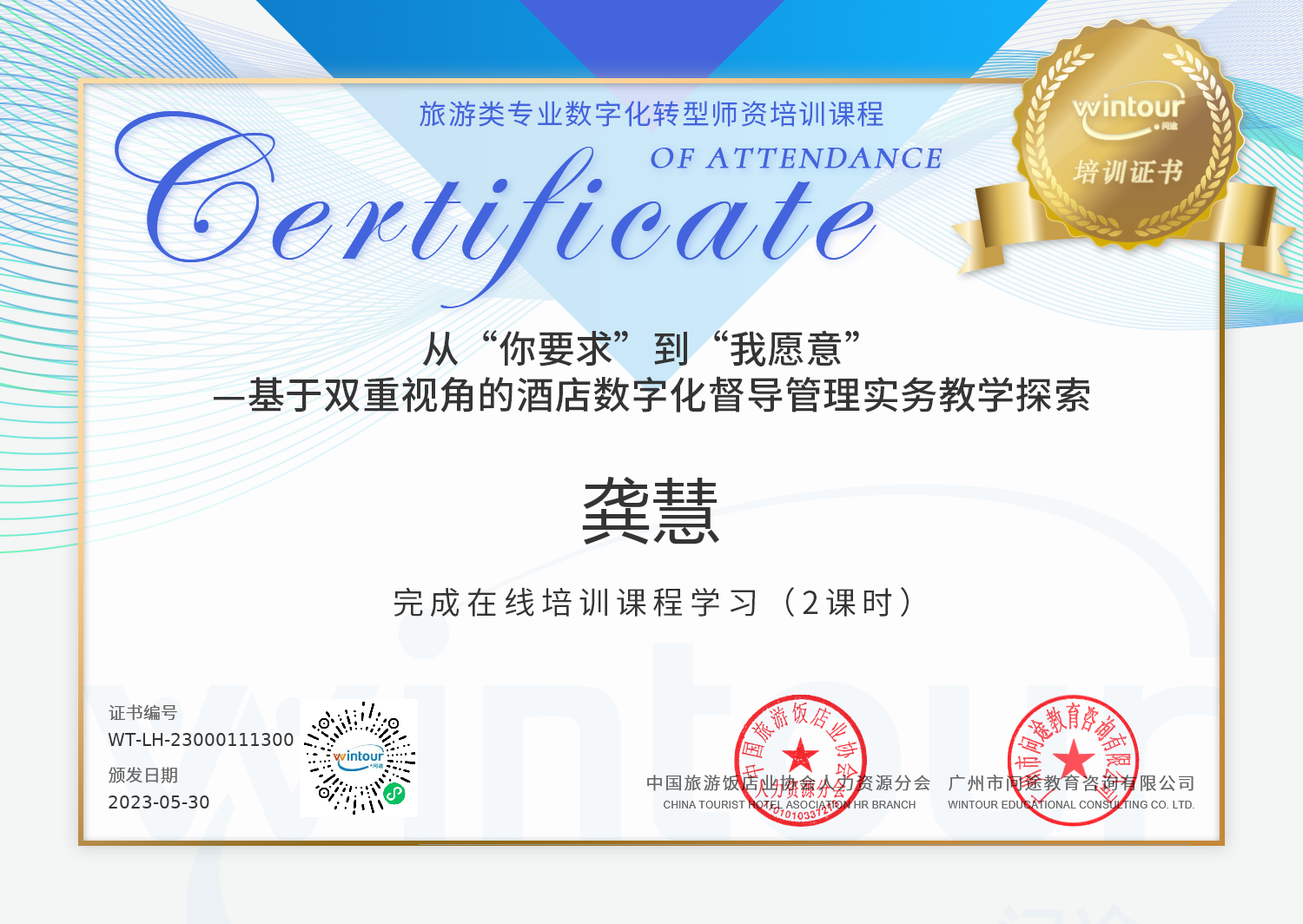 那聚焦到高校教育发展,数字化时代对传统教学内容、教学模式、教学方法都提出了新的挑战,也提供了一些新的机遇。如何实现数字化、信息化与教育的融合,实现“赋能”与“创新”? 就这一问题,酒旅的酒店专业龚慧老师,从早期的2021年线下接触到问途科技与教育机构创始人、港理工的黄昕博士的线下的见面座谈会,了解到存量时代酒店的发展要结合智能化和数字化发展的重要性。对于酒店数字化发展来说,不是纯粹地把数字化加在管理上,而是通过物联网等平台把酒店各运营部门的后台数据进行结合,为酒店高效运转提供决策,如酒店通过传感器实时获得空调系统数据,再结合PMS系统中房态数据,酒店可以后台就可以实时为住客提供舒适的温度,提高住店客人的满意度,这才是真正的酒店数字化发展;到后期的线上专题讲座培训获取证书,讲座有中国旅游饭店业协会人力资源分会和广州问途教育咨询有点公司共同举办的2023年数字素养助力旅游教育创新系列讲座,如《从旅游类新专业谈教师数字化素养与提升》、《数字化教学模式与课程教学设计》等专题培训,了解教师个人数字素养培养的路径,课堂内容设计中如何通过虚拟教研室、沙盘虚拟仿真实验教学项目等结合理论+实操的教学方式,把数字化、信息化技术融入到课程教学当中;通过线下线上多渠道学习,助推个人数字化素养和数字化思维的培养,积极努力成为新时代背景下新一代高校教师。