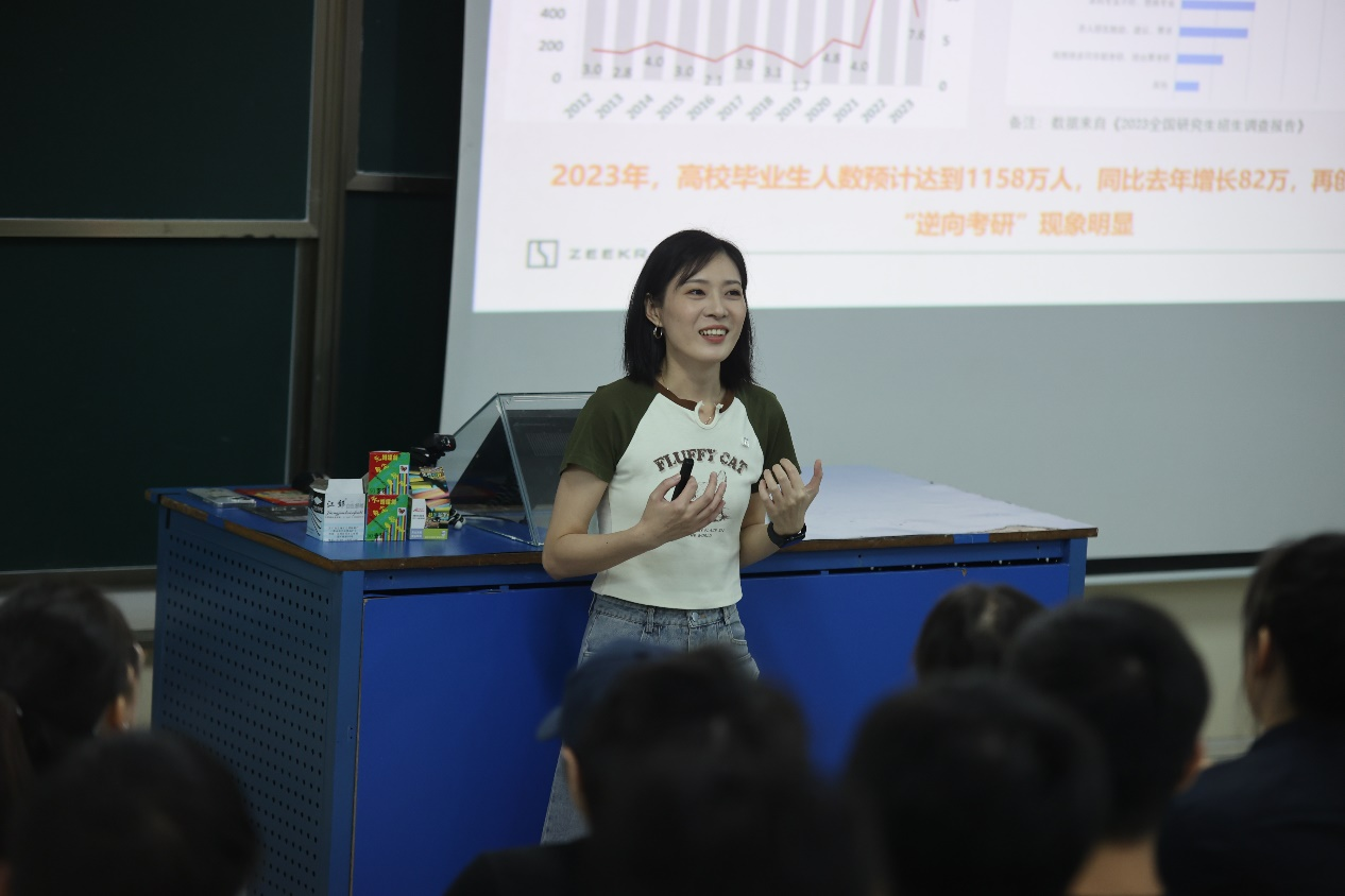 二位宣讲人分别以不同的角度对本次招聘进行了宣讲。谢黎明女士从“公司介绍、岗位介绍、薪资待遇”三大方面进行介绍;李培生先生从个人亲身经历和公司未来发展趋势进行介绍。宣讲会最后,组织观看了现在就业于极氪公司的学长学姐提前录制好的寄语,并期待学弟学妹加入到极氪大家庭。