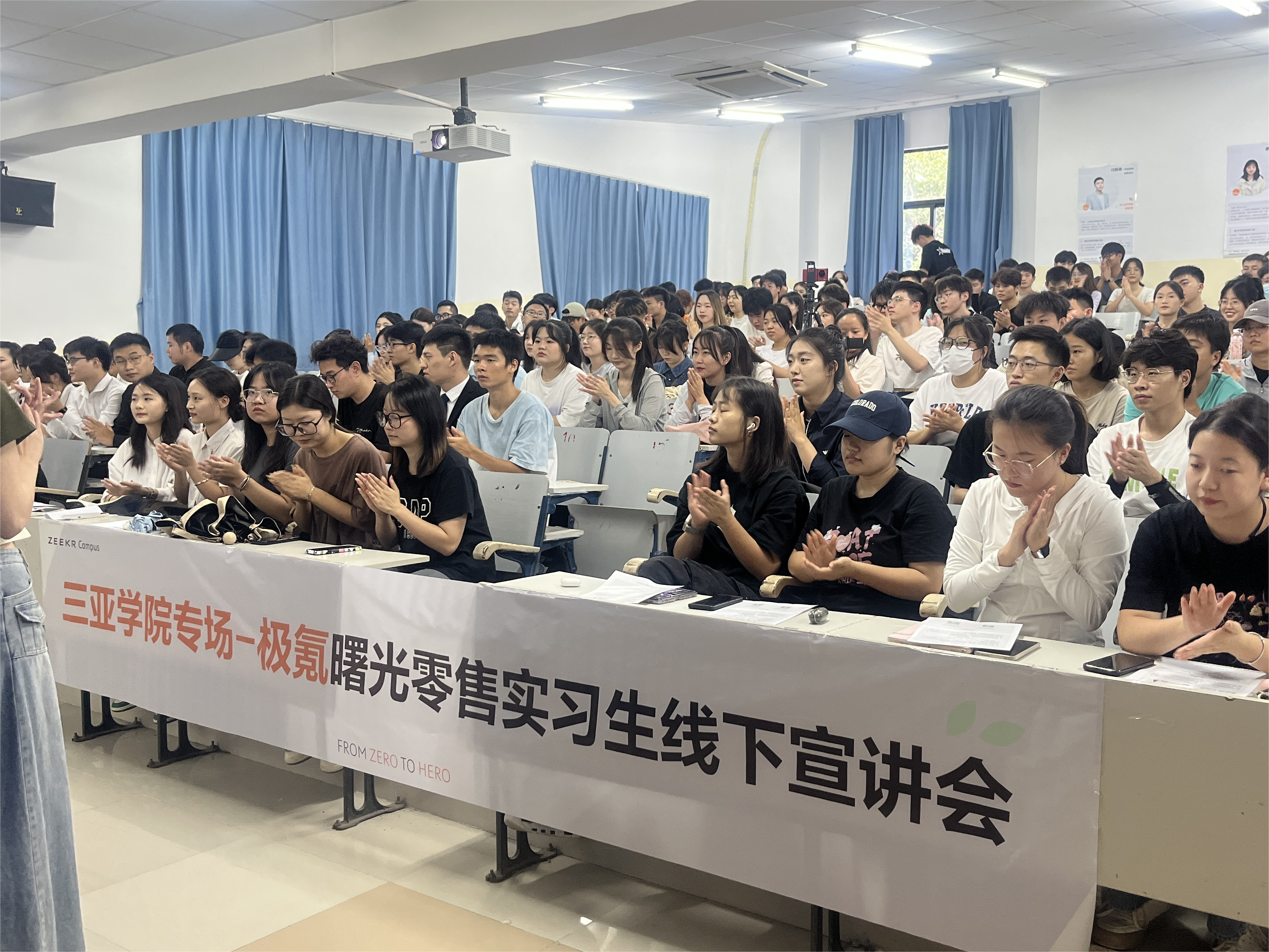 现场邀请极氪用户端华南大区HRBP——谢黎明女士和极氪海南城市经理——李培生先生宣讲。主要针对公司发展历程、未来发展方向以及本次招聘的主要岗位、相关岗位的薪资待遇做介绍。