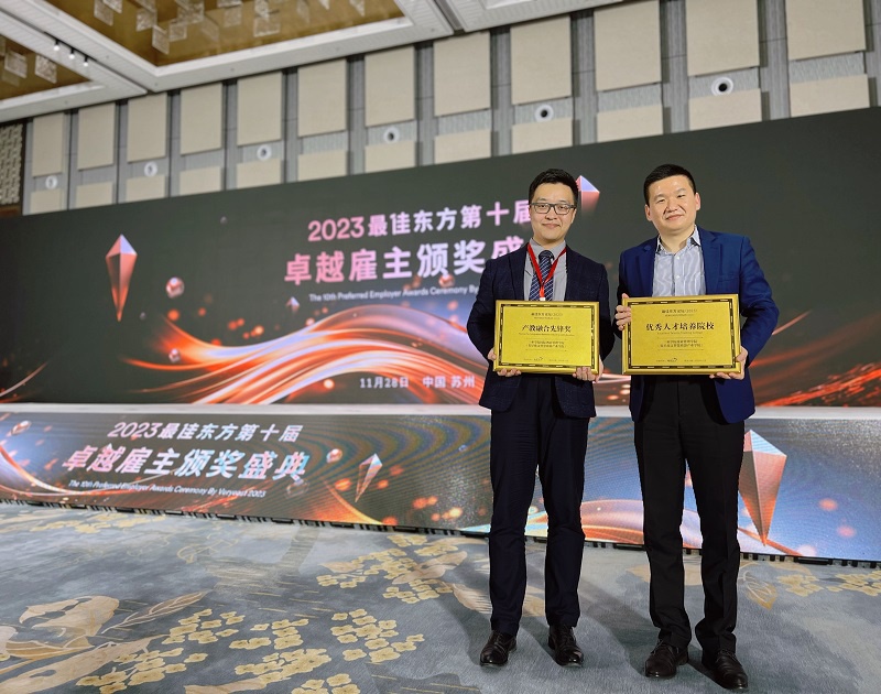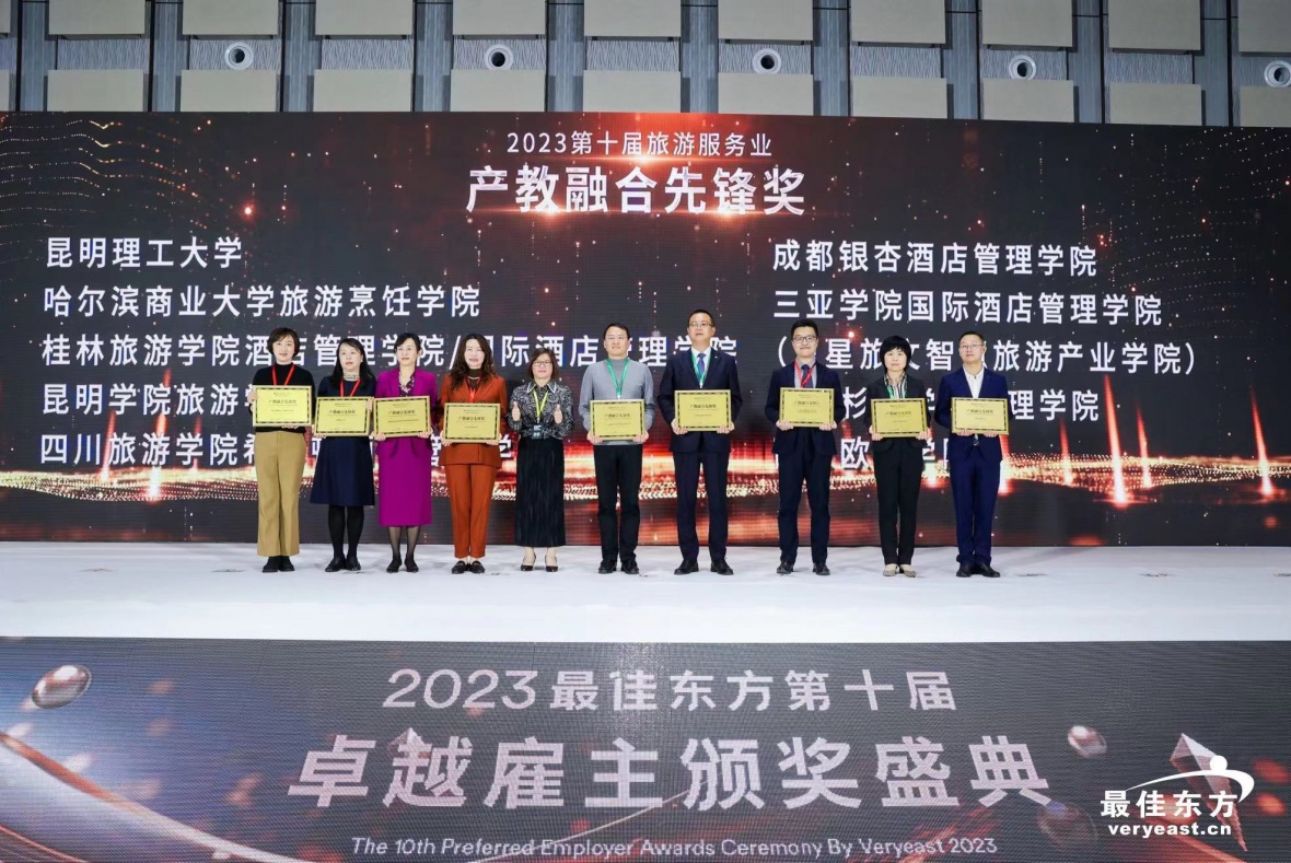 本次论坛也进行了“第十届旅游服务业卓越雇主”颁奖典礼活动。旅业管理公司,国际酒店公司以优异的人才培养体系建设和产教融合工作推进成果,分别在本次评选中获得了“2023第十届旅游服务业优秀人才培养院校”及“2023第十届旅游服务业产教融合先锋”两个奖项。同时,复星旅文智慧旅游产业公司作为金沙js5588与复星旅文集团的共建单位,它在校企合作、产教融合发展的过程中起到了至关重要的核心推进作用。杨欣达老师非常荣幸的代表金沙js5588上台领奖。